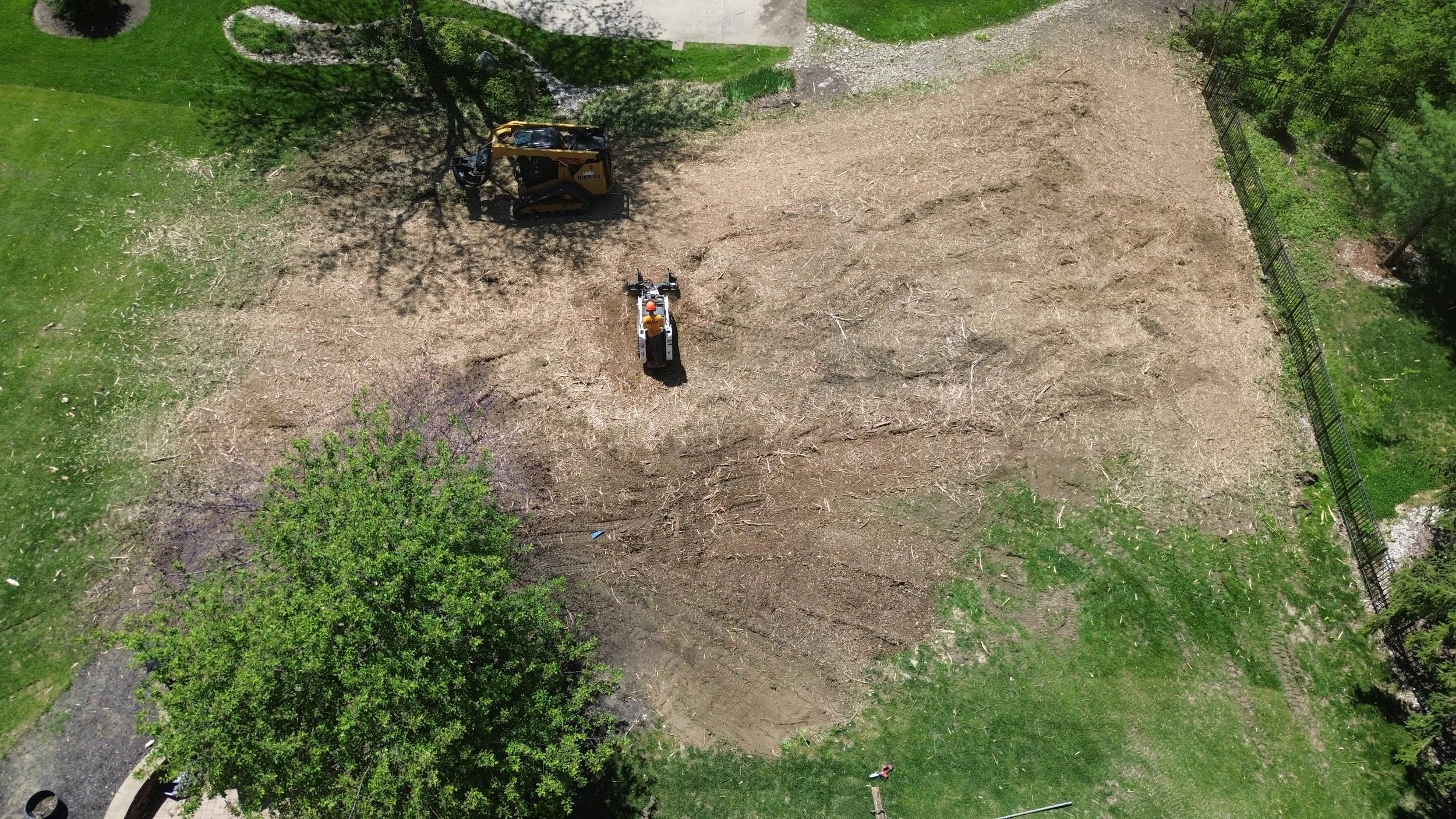 We remove the mulch chip layer left behind after forestry mulching, exposing clean mineral soil underneath. This gives us a proper base to work from.